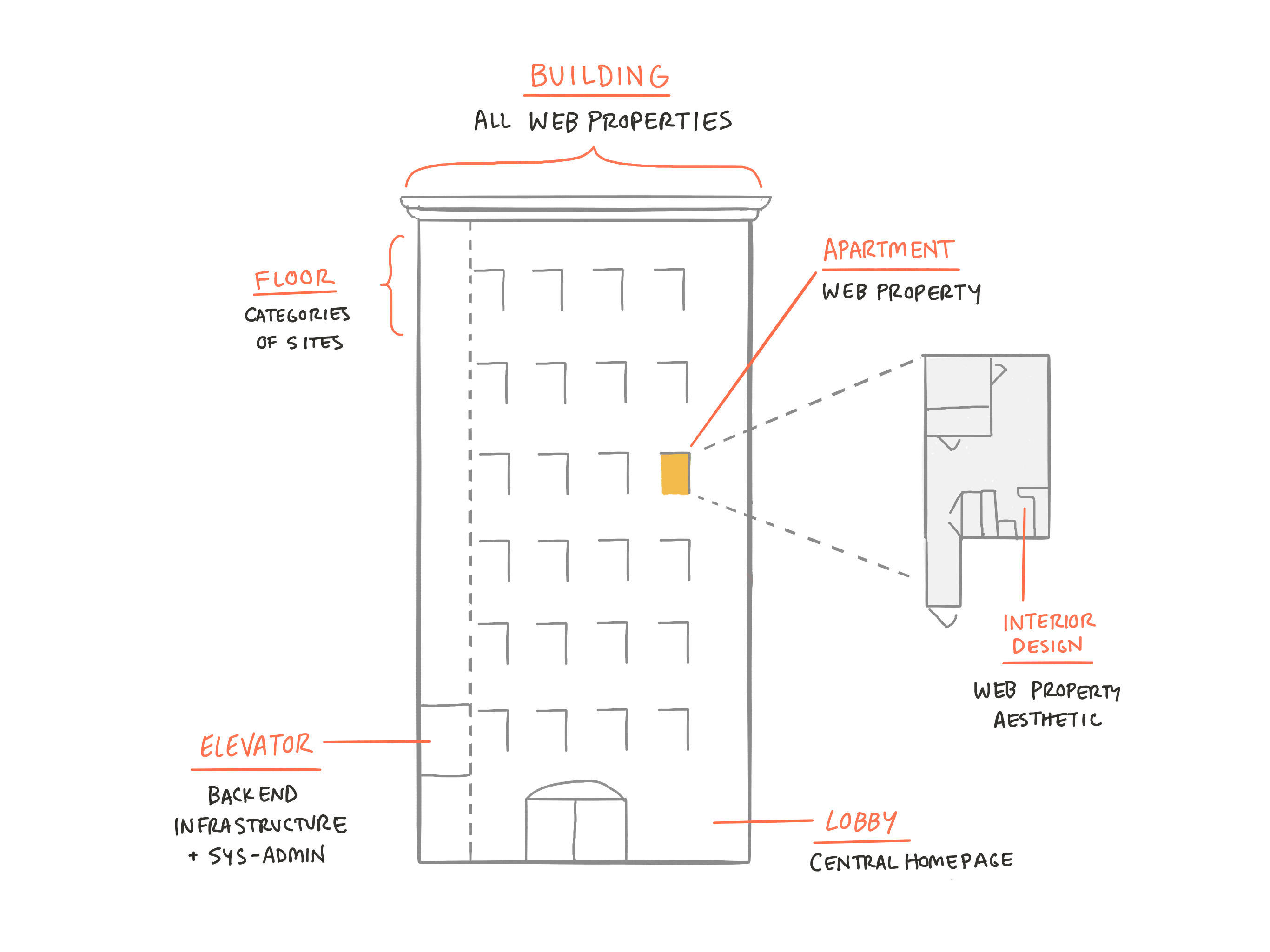 After a complex session to plan a massive website reorganization, I created this visual to help stakeholders understand how different technical components fit together.