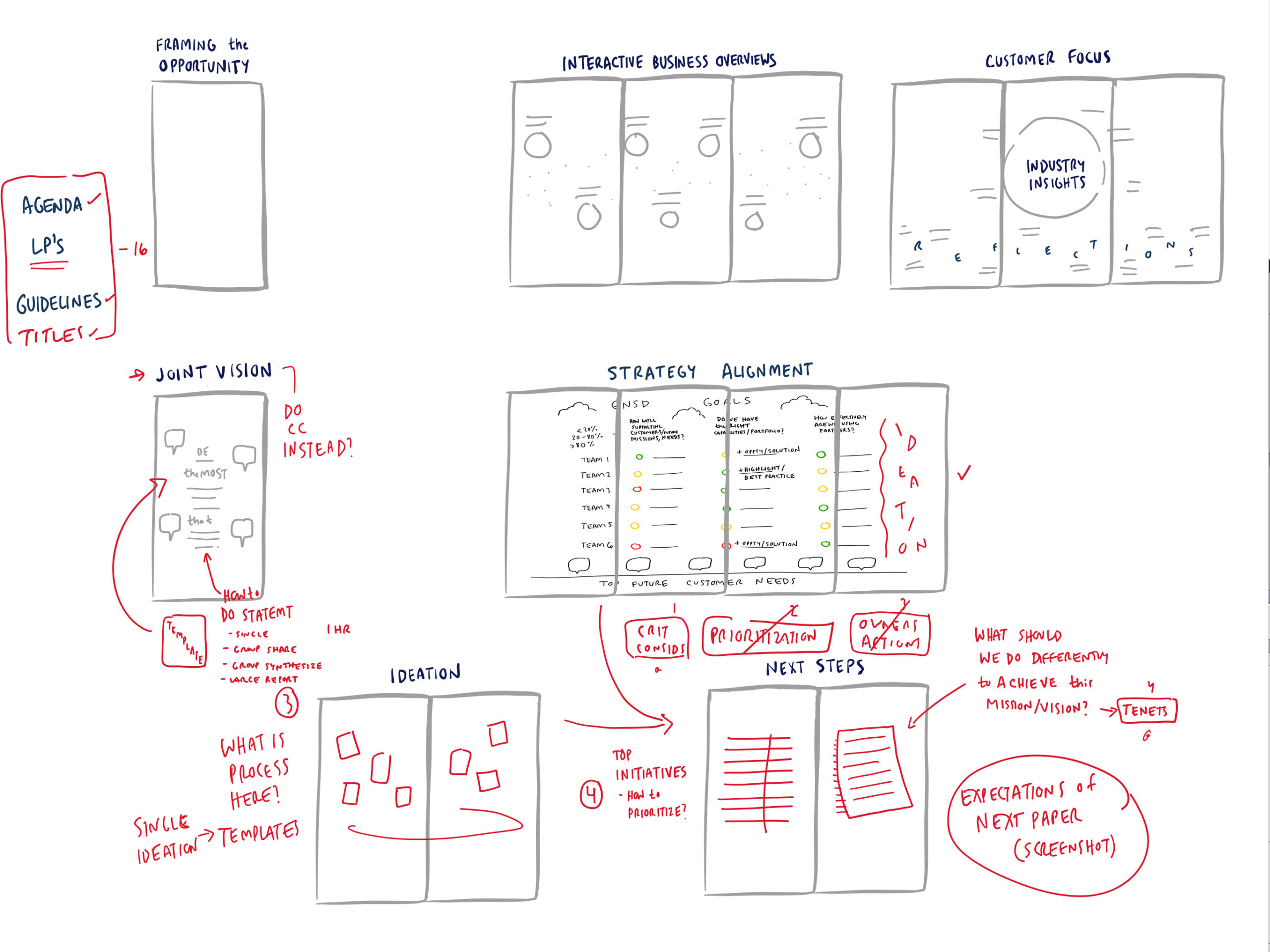 Finally, I design and deliver an engagement that allows teams to frame the opportunity on their own terms, better understand the customer, map their mission to a goal state, and formulate a path to get to that future vision.